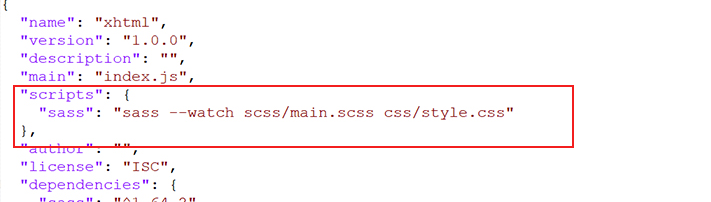 Everything is ready to write a small script in order to compile Sass. Open the package.json file in a code editor. You will see something like this: In the scripts section add an scss command